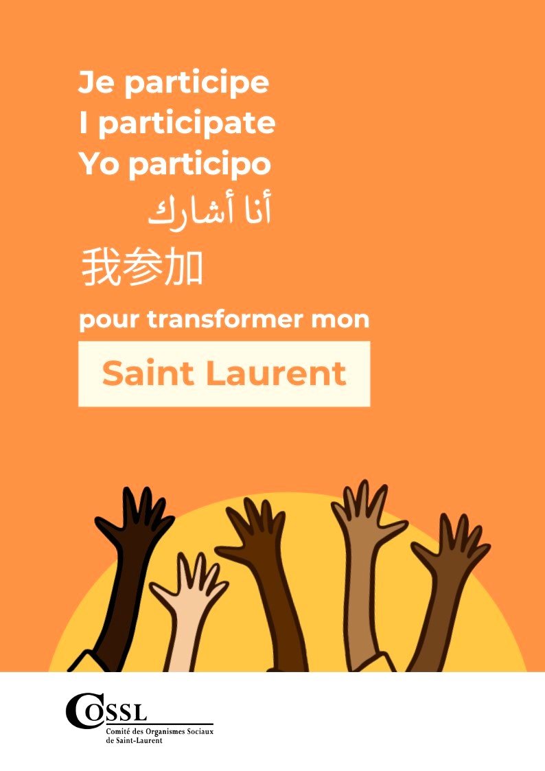 Êtes-vous un.e résident.e de Saint-Laurent ? Faites partie de la consultation citoyenne pour partager vos idées, vos opinions et vos suggestions pour améliorer les services et la qualité de vie dans Saint-Laurent. Le Comité des Organismes Sociaux de Saint-Laurent (COSSL) lance officiellement sa grande consultation citoyenne. En quelques minutes, vous pouvez jouer un rôle clé…